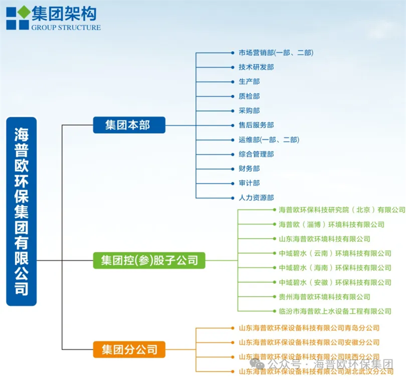 公司擁有環(huán)境工程專項設(shè)計乙級資質(zhì),環(huán)保工程專業(yè)承包壹級資質(zhì)、市政公用工程施工總承包二級資質(zhì)、建筑機電安裝工程專業(yè)承包二級資質(zhì)等資質(zhì),并通過了ISO質(zhì)量、環(huán)境、職業(yè)健康安全管理體系認證。同時取得了水污染治理設(shè)施運維能力評價二級,實現(xiàn)從設(shè)計、生產(chǎn)、安裝、調(diào)試、到運維的產(chǎn)業(yè)鏈一條龍服務(wù)。集團架構(gòu)