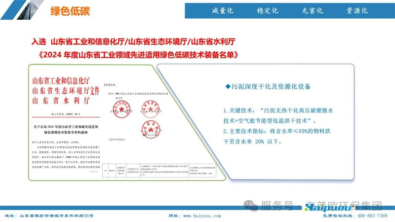 海普歐環(huán)保在污泥處理領(lǐng)域擁有10項發(fā)明專利,其“污泥資源化利用關(guān)鍵技術(shù)研發(fā)及產(chǎn)業(yè)化”項目更是榮獲山東省企業(yè)科技創(chuàng)新協(xié)會科技創(chuàng)新獎優(yōu)秀項目二等獎。集團憑借其在環(huán)保領(lǐng)域的突出貢獻和技術(shù)創(chuàng)新,成功入選山東省工業(yè)和信息化廳、山東省生態(tài)環(huán)境廳、山東省水利廳聯(lián)合發(fā)布的《2024年度山東省工業(yè)領(lǐng)域先進適用綠色低碳技術(shù)裝備名單》