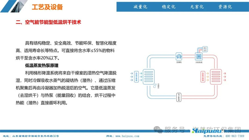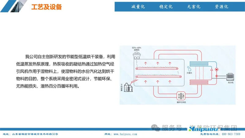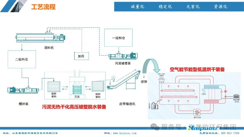 海普歐環(huán)保的核心技術(shù)——污泥深度干化及資源化設(shè)備,采用了“污泥無熱干化高壓破壁脫水技術(shù)+空氣能節(jié)能型低溫烘干技術(shù)”。這一技術(shù)組合能夠?qū)⒑省?5%的物料烘干至含水率20%以下,為污泥的后續(xù)資源化利用提供了堅實的技術(shù)支撐。其中,污泥無熱干化高壓破壁脫水技術(shù)通過自主研發(fā)的高壓破壁泵,在污泥輸送過程中完成壓力破壁,破壞污泥中微生物細胞的細胞膜,使內(nèi)部小分子滲出變?yōu)橥獠克,增加污泥的流動性,便于脫水。而空氣能?jié)能型低溫烘干技術(shù)則利用低溫蒸發(fā)熱泵原理,將濕熱空氣降溫脫濕,同時冷媒吸收水蒸氣的凝結(jié)熱,通過壓縮機聚集后再由冷凝器加熱脫濕后的空氣,實現(xiàn)熱能的循環(huán)利用,具有節(jié)能環(huán)保、安全高效、智慧化程度高等特點