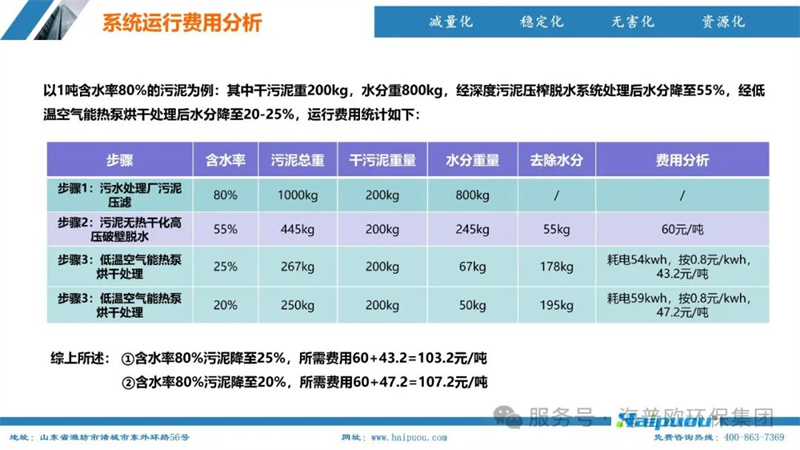 在項目實踐中,海普歐環(huán)保依托先進的技術(shù)裝備和專業(yè)的服務(wù)團隊,為市政污泥、管網(wǎng)污泥、工業(yè)污泥、河湖淤泥等多種污泥的處理提供了高效的解決方案。其污泥深度干化及資源化設(shè)備能夠?qū)⑽勰嗪式抵?0%以下,使污泥顆粒的低位熱值達到2200-3500Kcal/kg以上,可作為生物質(zhì)鍋爐燃料或摻混進入循環(huán)流化床鍋爐燃燒,實現(xiàn)了污泥的減量化、無害化和資源化利用。以1噸含水率80%的污泥為例,經(jīng)過深度污泥壓榨脫水系統(tǒng)處理后,含水率降至55%,再經(jīng)低溫空氣能熱泵烘干處理,含水率可進一步降至20-25%,運行費用僅為103.2-107.2元/噸,具有顯著的經(jīng)濟和環(huán)境效益。