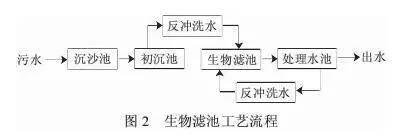 其最大的特點(diǎn)是集生物氧化和截留懸浮固體于一體,節(jié)省了后續(xù)沉淀池,厭氧水解—高負(fù)荷生物濾池處理系統(tǒng)集初沉池、曝氣池、污泥回流設(shè)施以及供氧設(shè)施等于一身,大大簡(jiǎn)化了污水處理流程。生物濾池工藝流程見(jiàn)圖2。
