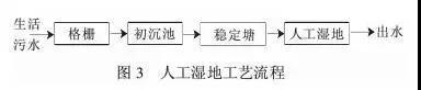 是利用人工水生態(tài)系統(tǒng)內(nèi)多級(jí)生物的稀釋降解作用來(lái)去除或削減水中污染物的方法。人工濕地作為一種新型生態(tài)污水處理技術(shù)具有投資和運(yùn)行費(fèi)用低、抗沖擊負(fù)荷能力強(qiáng)、處理效果穩(wěn)定、出水水質(zhì)好、水生植物有一定經(jīng)濟(jì)價(jià)值等諸多優(yōu)點(diǎn)。用于農(nóng)村生活污水處理的主要是潛流人工濕地。人工濕地處理工藝流程圖見(jiàn)圖3。