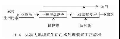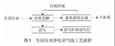 新型生活污水厭氧凈化池(或稱城鎮(zhèn)生活污水凈化沼氣池)是一種小型分散化污水處理裝置。生活污水凈化沼氣池是在化糞池和沼氣池的基礎(chǔ)上發(fā)展起來(lái)的,解決了化糞池處理效果差、沉積污泥多、沼氣池沼氣回收率低的弊端,其工藝流程見(jiàn)圖5。
