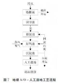 適用于地勢(shì)條件易于集水污水并能通過(guò)自流出水的且規(guī)模適中的村莊,處理規(guī)模20~200t/天。工藝參數(shù):缺氧池停留時(shí)間不小于4h,好氧池停留時(shí)間不小于6h,污泥清理周期180天,人工濕地水力負(fù)荷0.5~1.0m3/(m2˙d),工藝流程見(jiàn)圖7。
