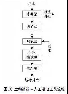 本技術(shù)適用于處理要求一般,規(guī)模較小,距離居民區(qū)較遠(yuǎn)的污水處理設(shè)施,處理規(guī)模10~30噸/天。工藝參數(shù):集水池停留時(shí)間不小于12h,缺氧池停留時(shí)間不小于12h,生物濾塔負(fù)荷0.2~0.3m3/(m2˙d),人工濕地水力負(fù)荷0.5~1.0m3/(m2˙d),污泥理周期180天,工藝流程見(jiàn)圖10。