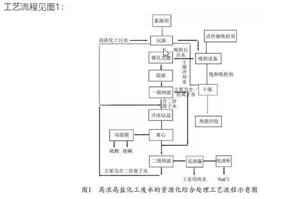 一、介紹一種高濃高鹽度化工廢水資源化綜合處理工藝,該工藝主要包括以下步驟:廢水集中,加入有機(jī)絮凝劑,沉降大顆粒雜質(zhì)及大部分懸浮物、漂浮物;加入活性炭吸附劑,吸附有機(jī)質(zhì);過濾,去除水中的顆粒雜質(zhì)、膠體物質(zhì)和懸浮物,再經(jīng)一級納濾分離出廢水中的一二價離子;一價離子水經(jīng)反滲透制取純水,用于工業(yè)用水;一價鹽提濃,經(jīng)電滲析制取NaCl副產(chǎn)物;二價離子水經(jīng)冷凍結(jié)晶,離心后的結(jié)晶層經(jīng)雙級膜電滲析制取酸堿產(chǎn)物,水層經(jīng)納濾處理;吸附有機(jī)質(zhì)的飽和吸附劑經(jīng)脫水干燥,再經(jīng)回收。本工藝成本低,可同時去除廢水中的有機(jī)物和無機(jī)鹽,節(jié)約能源,環(huán)保。