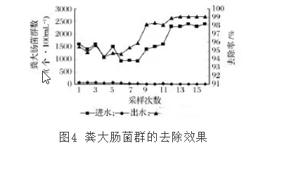 由于在處理站安裝了紫外線消毒設(shè)備,從圖4可以看出,進(jìn)水中的糞大腸菌群在1600~2400/100mL之間,出水中的糞大腸菌群在30/100mL以下,去除率在95%以上。出水達(dá)到設(shè)計(jì)指標(biāo),可用于農(nóng)田灌溉。