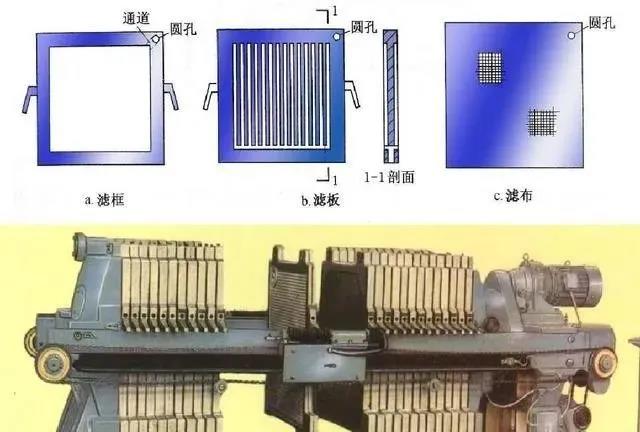 包括過濾板和過濾布。通過一臺泵將待濾懸浮液輸送到各個壓緊過的濾室,其中懸浮液通過濾布,通過每一塊濾板上的濾液孔排出體外,懸浮液中的固體顆粒聚集在濾室內(nèi),逐漸形成濾餅,濾餅在濾室內(nèi)充滿濾室,即完成一次過濾循環(huán)。